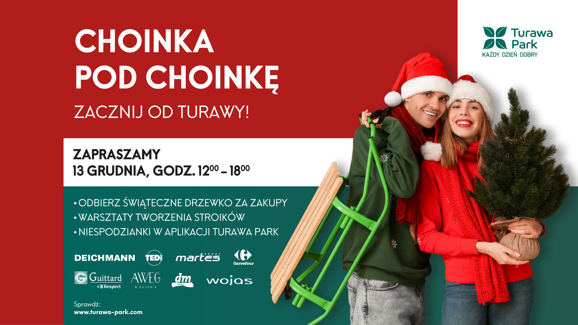 • odbiór żywej choinki za zakupy (odbiór żywej choinki za zakupy (można łączyć dwa paragony, na minimalną kwotę 200 zł lub 300 zł z Carrefour). W akcji honorowane są paragony z dnia akcji, ze wszystkich sklepów należących do CH Turawa Park, lista dostępna jest na stronie https://turawa-park.com/brands/, z wyłączeniem: stacji paliw oraz kantoru wymiany walut, a także produktów wskazanych w regulaminie.),