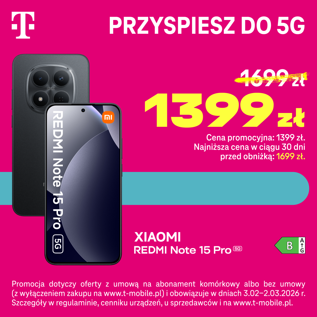 Teraz XIAOMI REDMI Note 15 Pro 5G w cenie 1.399 zł. Promocja dotyczy oferty z umową na abonament komórkowy albo bez umowy (z wyłączeniem zakupu na www.t-mobile.pl) i obowiązuje w dniach 3.02 -2.03.2026r. Szczegóły w regulaminie, cenniku urządzeń, u sprzedawców i na www.t-mobile.pl.